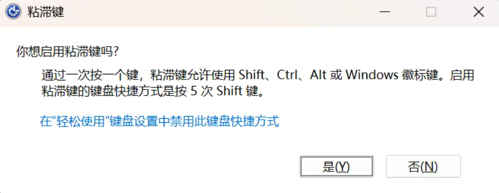 5次Shift键;若弹出「粘滞键设置」窗口(而非