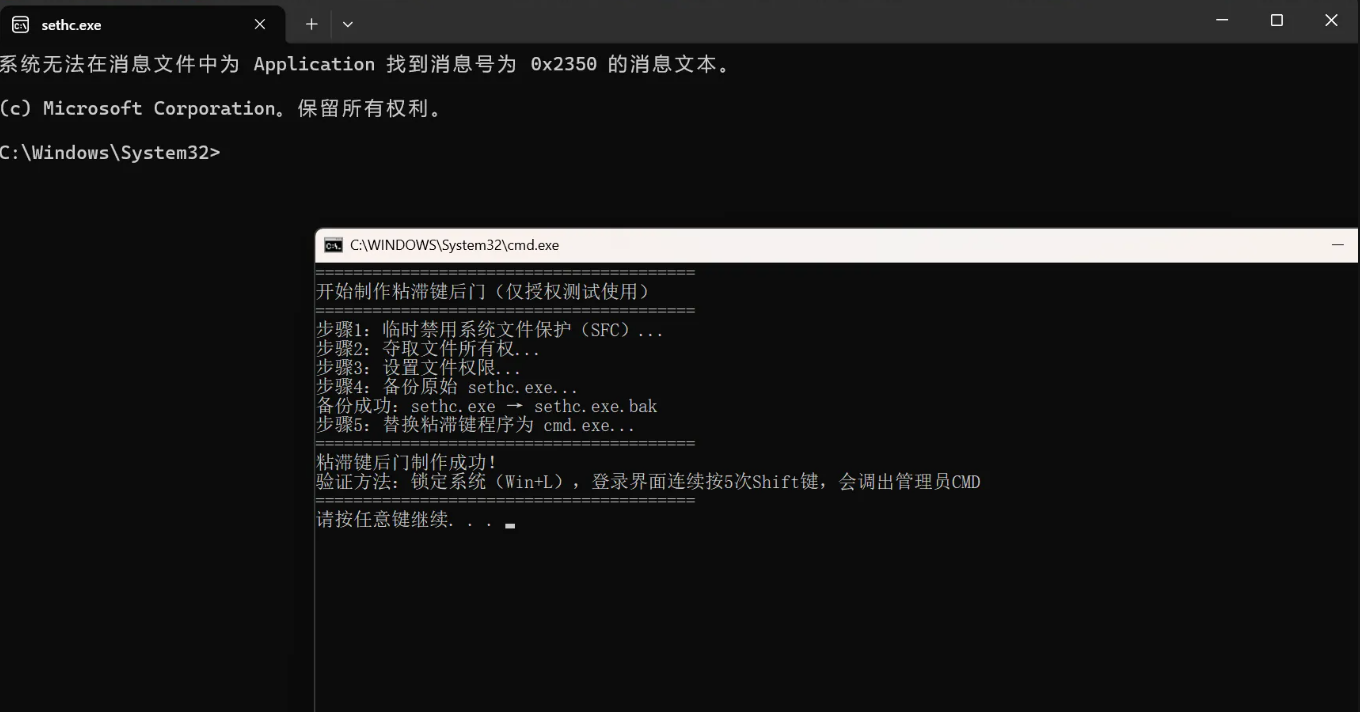 echo 验证方法:锁定系统(Win+L),登录界面连续按5次Shift键,会调出管理员CMD